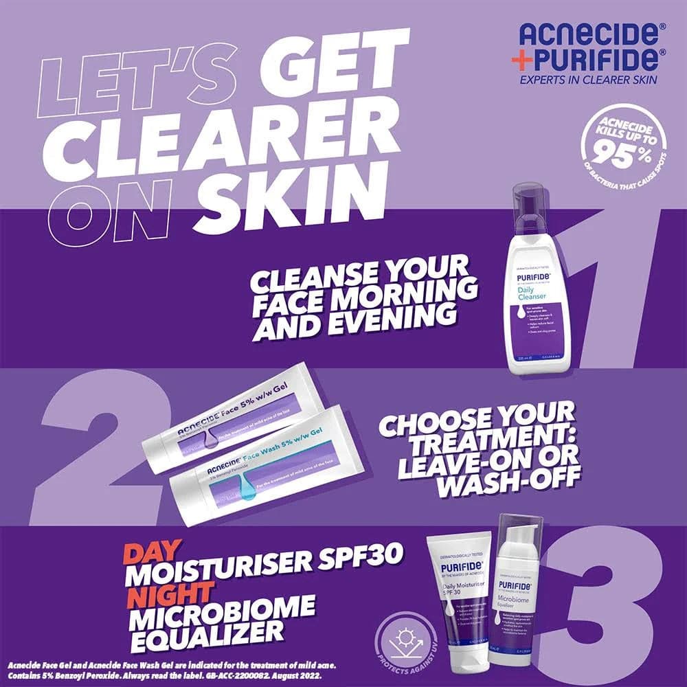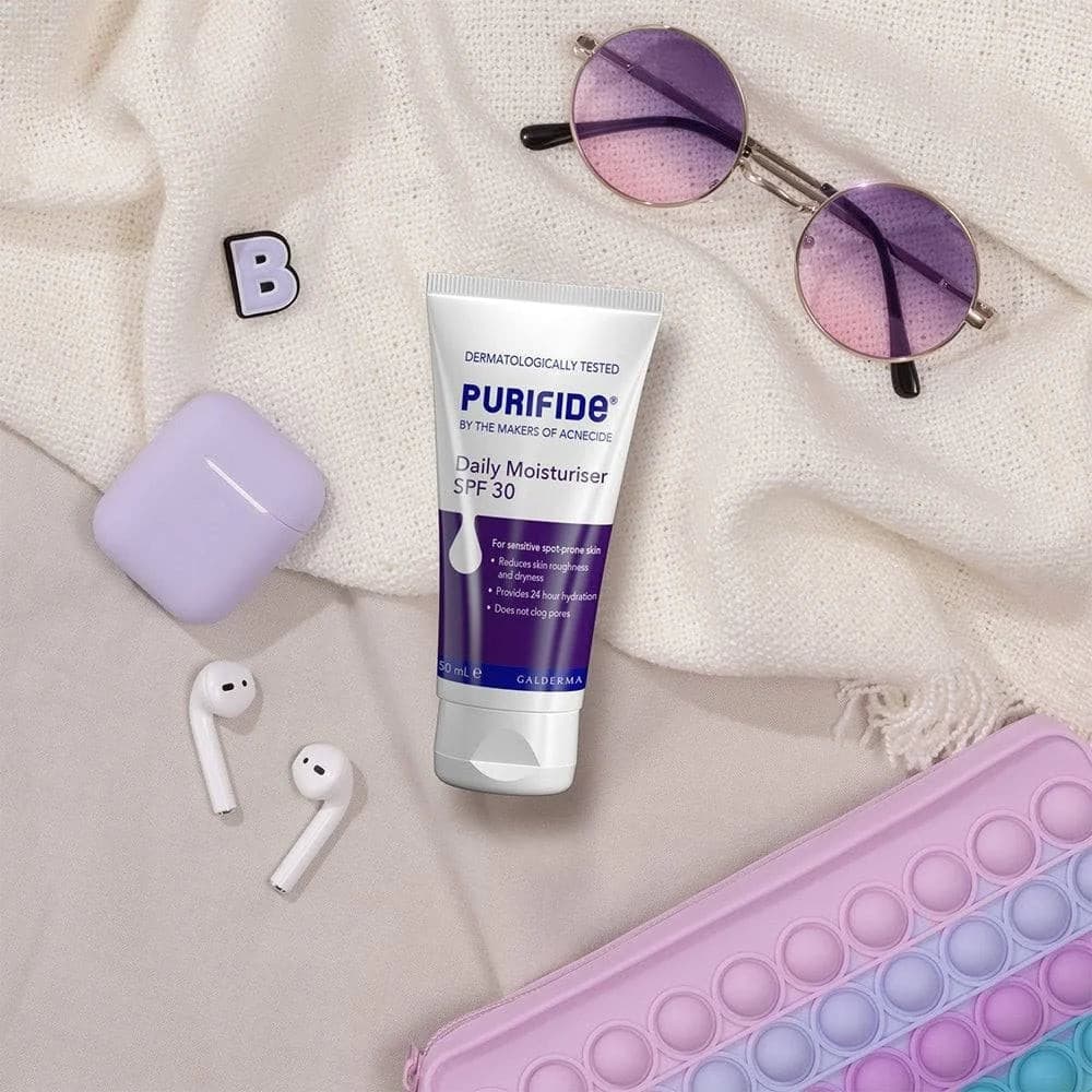 Purifide is the NEW range of clear skin daily skincare, from the makers of Acnecide. Purifide Daily Moisturiser SPF30 lightweight non-greasy moisturiser specifically formulated for hydrating and protecting sensitive spot-prone skin. Containing a barely-visible UVA/B sunscreen, this is suitable for a wide range of skin tones.